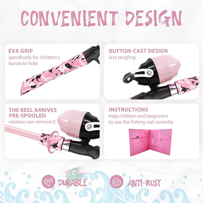 • Easy to Set Up and Use: No need to worry about complicated installation steps. The telescopic fishing rod and pre-spooled reel design allow kids to start fishing right away. The package includes instructions to help beginners learn quickly, give children their best chance of making a catch