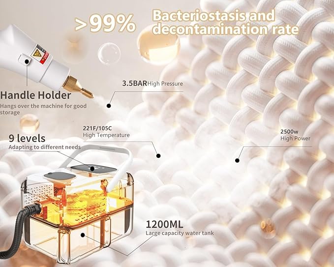 • Powerful Pressurized Steam Cleaner - Foandbevi handheld steam cleaner features 2500W power, quickly generating steam up to 221℉(105℃) 3.5 Bar in 15s. No need to wait to deeply clean and eliminate grease, grime, dust, and stains from all surfaces