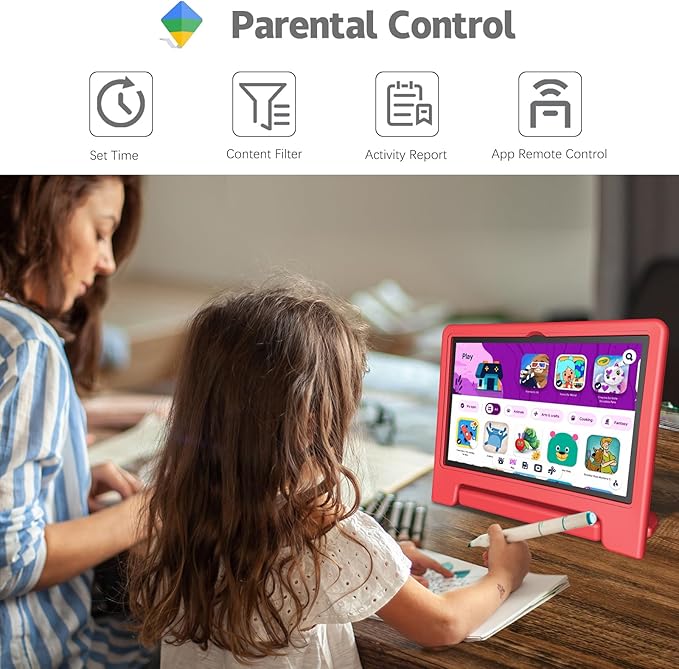 • Easy Parental Control: Google Family Link Parent Dashboard allows you to limit screen time, set content filters, and password protection. Allow the content you want and learn about their activities on the kids tablet gives you complete control of every aspect, which will give you peace of mind when you hand your child the tablet.