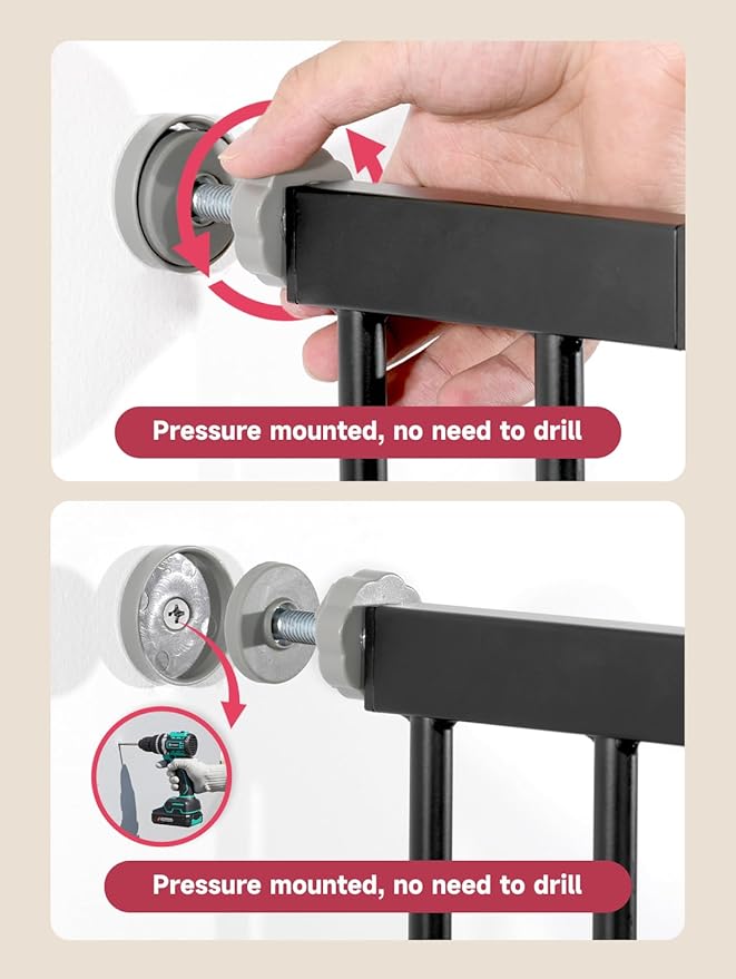 • Easy to Install and Wall Friendly: The pressure mounted baby gate is easy to assemble and disassemble. It is sturdy, durable, convenient, and doesn't require drilling or tools, which can protect your walls from damage and keep the wall clean and intact even after the baby door is removed. You can remove it at any time when not in use and it can be reused. (Measure the installation distance of the upper and lower walls. Make sure the door is betwwen 29.5 9-40.5" wide)
