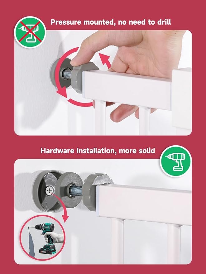 • Keep Your Little Ones and pets Safe: The baby gate for stairs is made of all-metal structure, it can withstand impacts from pets. Don't need to worry about baby gates with door being pushed down and hurting your children or dogs. The pet gate is chew-proof, lead-free and non-toxic, providing a secure barrier wherever you need it. Ideal for a family with children and pets