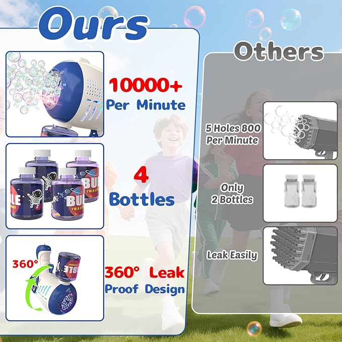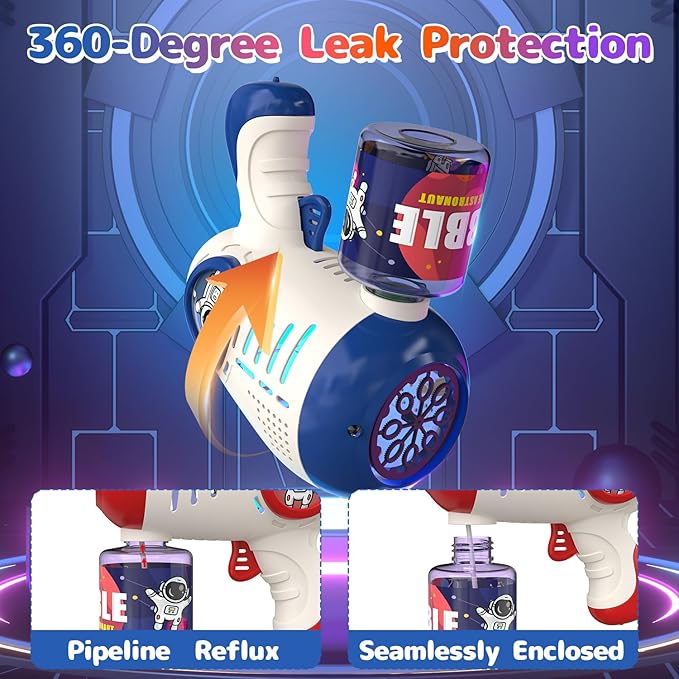 • MAGICAL LIGHT-UP DESIGN: Each bubble gun comes equipped with built-in LED lights, turning every bubble burst into a sparkling rainbow show. Watch your child's face light up as glowing bubbles fill the airβ€”perfect for evening fun or festive celebrations