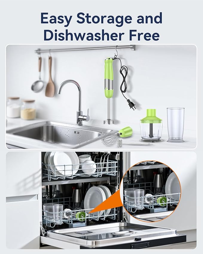 • Easy to Clean: The snap-on/off detachable attachment design makes this emulsifier blender easy to connect and disconnect and a breeze to clean as they all comes off easily than a regular blender. You can just rinse it off after use or wash it in dishwasher. It can hang with the hook and the main body can easily be cleaned by wiping with a soft damp cloth. (except blender shaft and chopping bowl lid requires hand wash and the water temperature of the dishwasher should be below 75°).