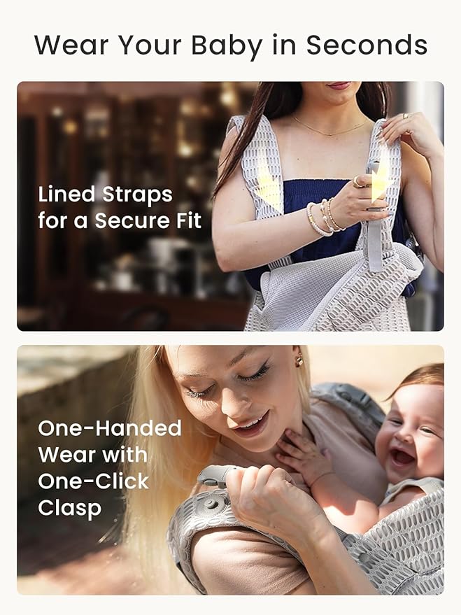 • Slip On the Baby Carrier in Seconds—It’s That Easy! Slide it on like your favorite sweater, then let our innovative sliding quick-release clasps do the work: they align perfectly, click securely in an instant, and let you lock it down with just one hand. All in a single second. Effortless, solo, and a perfect, safe fit every time.