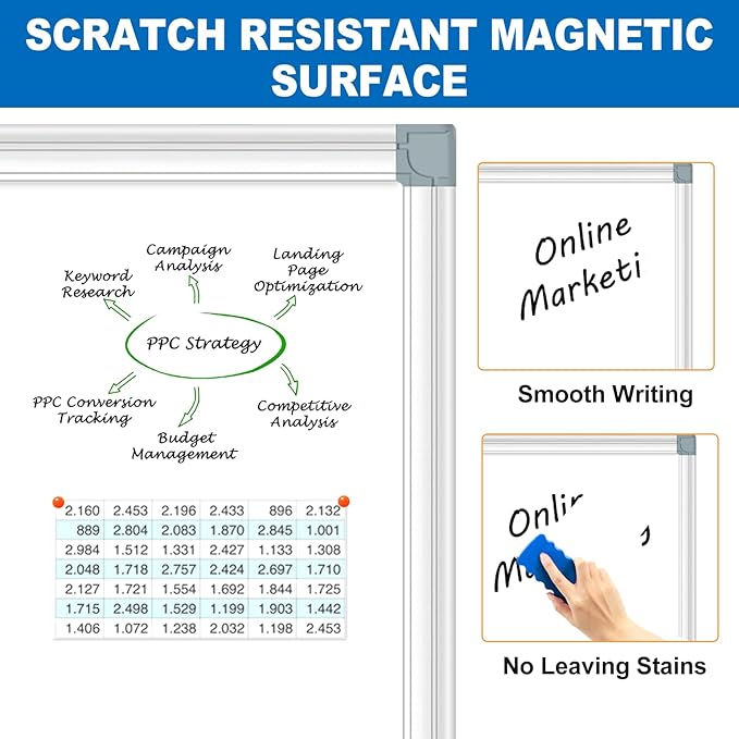 • PREMIUM MAGNETIC DRY ERASE BOARD: Crafted with a specially lacquered surface for a smooth and durable writing experience, our magnetic dry erase board boasts high-quality construction. The robust silver aluminum frame is scratch-resistant, and the ABS plastic corners with secure screw-fixing ensure safety and long-lasting durability. The detachable marker tray keeps writing essentials within reach, emphasizing convenience and safety without any sharp edges.