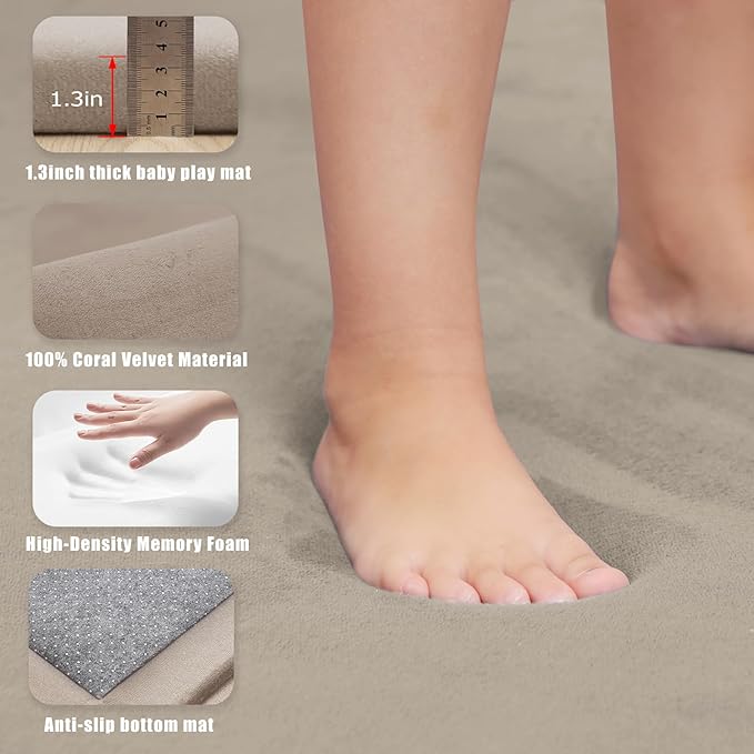 Baby Play Mat for Floor, 1.3" Thick Extra Large Cushioning Memory Foam Playpen Cushion, Soft Coral Velvet Tummy Time Mat with Non-Slip Backing, Child Nursery Rug for Toddlers, Kids (Beige, 79X59)