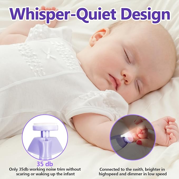 • Low Noise – The Baby electric nail trimmer is equipped with a whisper-quiet design. Only 35dB operating sound. You can file nails even as the baby sleeps, without causing any disturbance. You can use it in the dark at night.