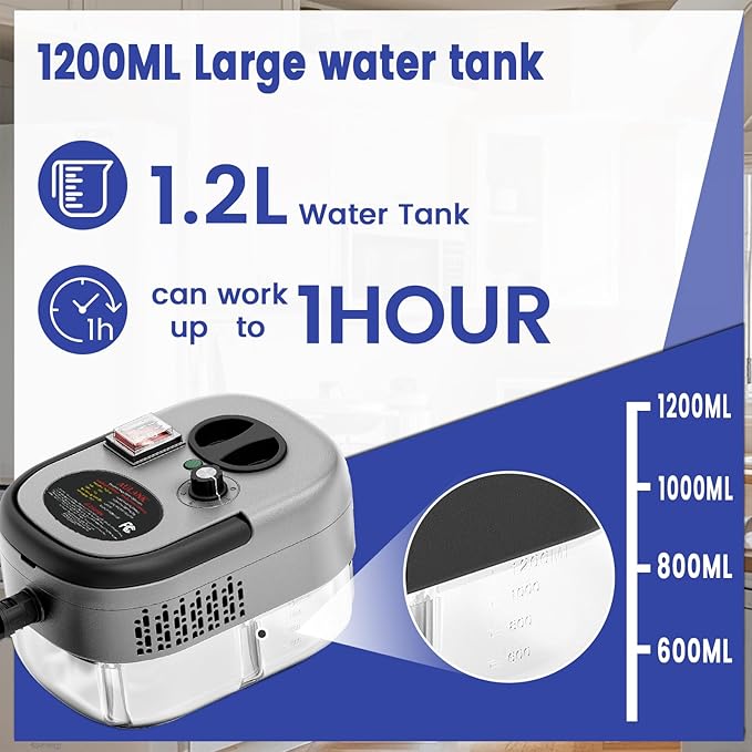 • 【1200ml Water Tank & Portable】The home portable cleaning machine is equipped with a 1.2 large water tank, allowing you to focus on cleaning, not only supporting adding water at work, but also using water for 1 hour at a time, even if it is far away from the water source, it can extend the cleaning time without adding water frequently, providing work efficiency. In addition, the washer's compact design weighs only 3.8 pounds, making it easy to carry with you for cleaning.