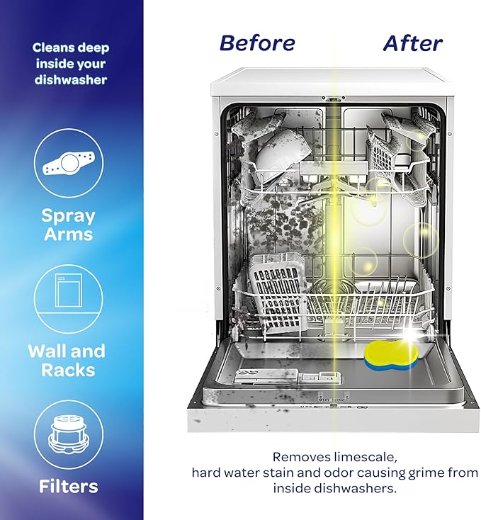 • Powerful Descaling: This dishwasher cleaning solution uses citric acid to remove hard water, lime, scale, grime, and grease. It also eliminates gunk spots, prevents clogs, and clears foam in jets, tubes, and filters for thorough cleaning