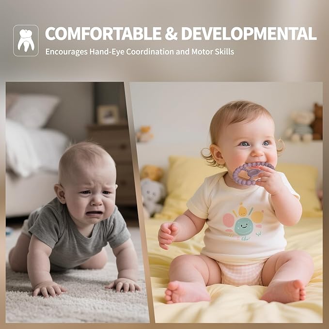 • Safe & Teething Relief Toys for Babies: Our food-grade silicone teething rings for babies 3-6 months are BPA-free, non-toxic, hypoallergenic and CPC-compliant. These teething toys offer soothing gum relief, are comfortable teethers for babies 6-12m.