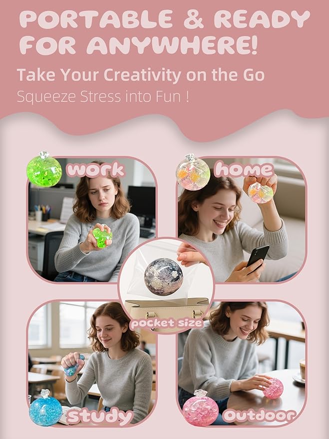• Create Your Stress Sanctuary: Mix fillers clays slime and colors to design a stress relief ball that’s uniquely yours great for mid day breaks.