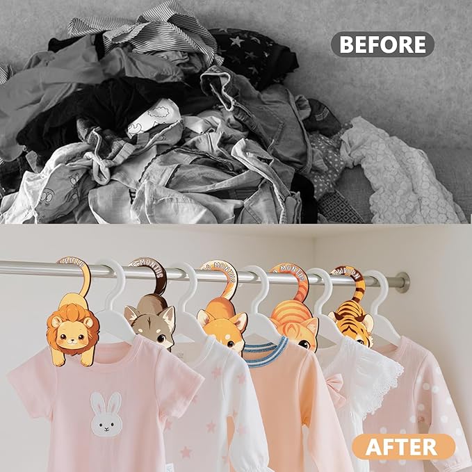 • 【Unique Animals Design】Our baby closet dividers feature an adorable animal theme, with each divider showcasing a unique and charming animal design (8 different animals including cat, tiger, horse, and more!). The back of each divider is blank, allowing for easy DIY customization. The top of the dividers is marked with month information, helping you quickly find the baby clothes you need by age