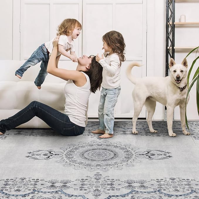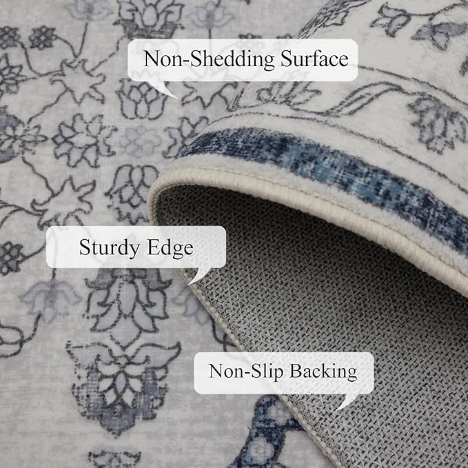 4x6 Washable Area Rug for Living Room, Carpet for Bedroom, Soft Faux Wool Retro Dining Room Rug, Non Slip&Non-Shedding Resistant Low Pile Vintage Print Rug for Home Office (Grey/Blue)