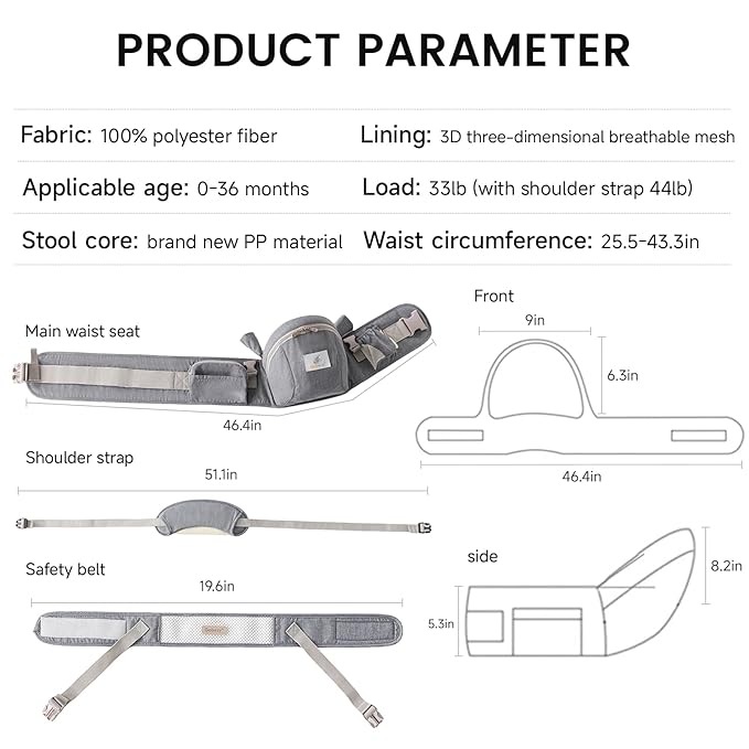 • Full safety details: The baby hip carrier has a mountaineering-grade buckle that is firm and does not slip, an anti-fall safety belt (exclusive for the upgraded version), and a night reflective strip to protect every moment of travel; anti-slip and shock-absorbing stool surface, 15MM sponge + silicone particles, the baby sits steadily and comfortably.