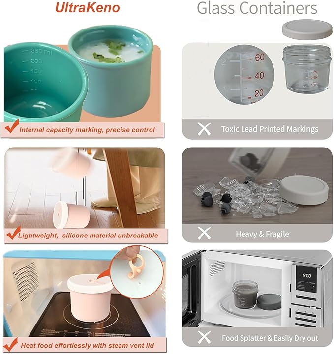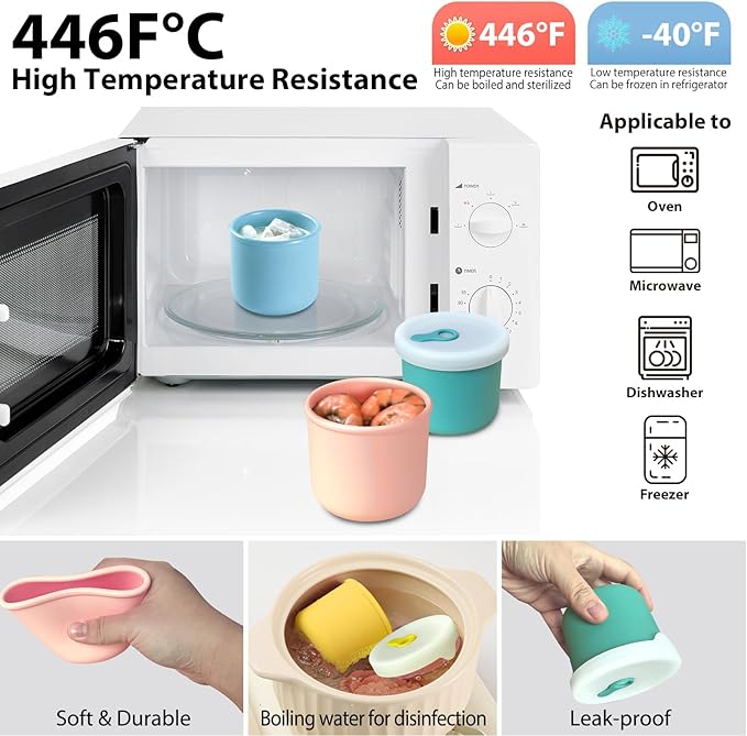 • 100% Leakproof, Easy Open and Clean: These silicone snack containers with silicone lids provide better air-tightness to keep the snack cups sealed and keep the foods inside fresh, even for storing soup, milk, and other liquids without leakage in your bag