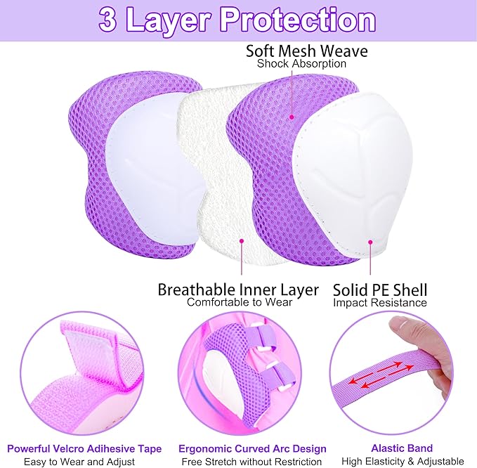 • 【Knee Pads and Elbow Pads Set for Kids】 The kids bike helmet comes with 2 x Elbow Pads, 2 x Knee Pads, and 2 x Wrist Pads. Consist of an anti-scratch extra hard PVC shell for protection, and velcro adjustable straps ensure the protective gear will not shift. Protective gear pad set provides comprehensive safety protection for children.