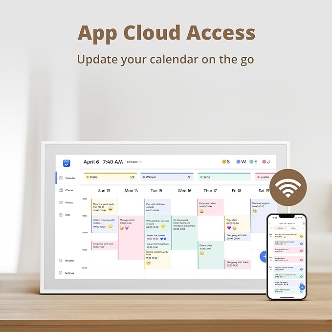 • 【Manage from Anywhere】: Stay connected with the powerful eCalendar App. Access and manage your calendar on the go, with free features like a photo frame, chore chart, dinner plan, grocery list, and more. Paid functions like Magic Import offer advanced tools tailored for users with special needs.
