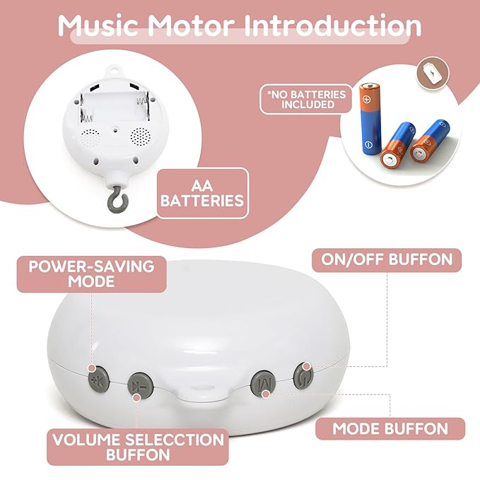 • 【35 Lullaby Music】The baby musical mobile plays 35 soothing classical melodies to help soothe your baby to sleep. The music box has 3 modes: music only, spinning only, and spinning with music. Requires 2 AA batteries (not included). (Tips: Each piece of music plays for 20-25 seconds). It creates a harmonious and relaxing atmosphere to keep your baby comfortable while sleeping. Automatically shuts off after 30 minutes to save power.
