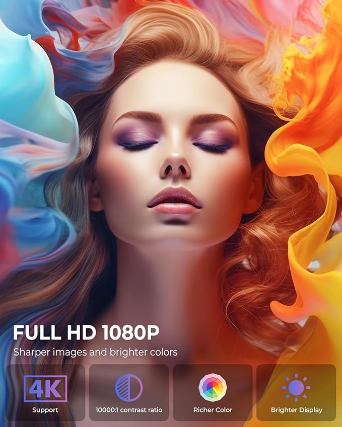 • Latest Upgraded Smart Mini Projector: The Mini projector is equipped with advanced LCD screen technology, Supports Full HD 1080P and 4K resolution, can vividly reproduce the details and colors of the image; good brightness of 10000 lumens, and a contrast of 10000:1.The excellent 1.29:1 projection ratio allows you to get a larger screen size even in a small space. Smart Projector liberates your hands, bringing you a more convenient and comfortable projection experience.
