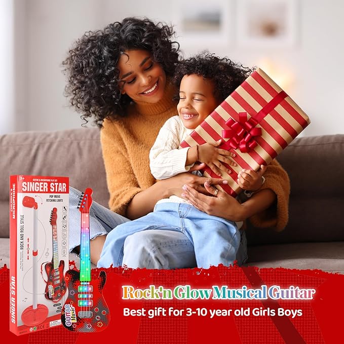 • 【Toddlers Guitar Early Learning Toys】——Music plays a crucial role in children's development! Electric guitar for infant and toddler with nursery rhyme melody and dazzling colourful lights accompanies the growth of girls and boys, while cultivating kid's interest in music, helping you teach your child beats or other music theories. The mini microphone and adjustable stand set will simulate speech and performance scenarios anytime and anywhere, enhancing your child's self-confidence and social skills.