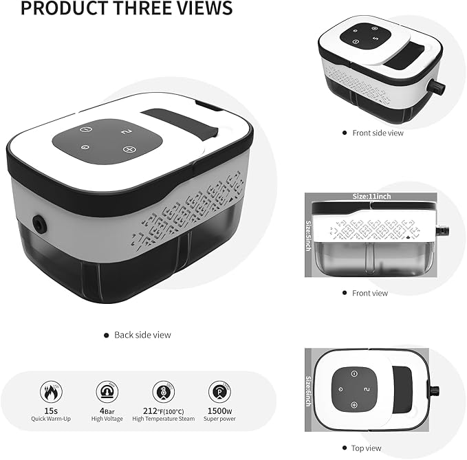 • Material & Design:Constructed from durable ABS plastic for excellent heat and impact resistance.Features a large, 42.27 oz see-through water tank, enabling easy monitoring of water levels and usage.Offers three adjustable steam settings – effortlessly increase or decrease steam