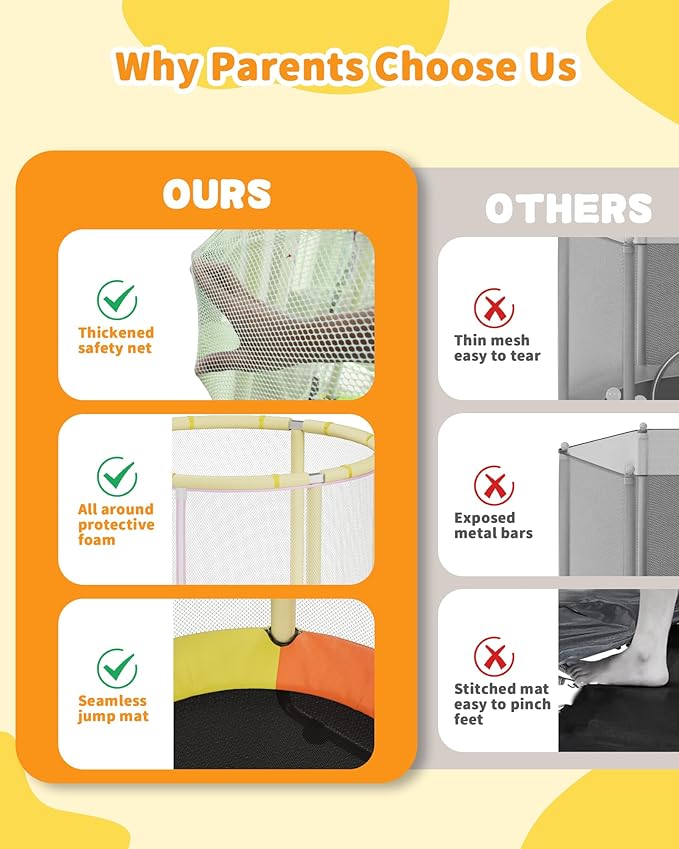 • 【All-Around Safety Design】This outdoor trampoline features a thickened mesh safety net, 360° foam-padded handlebars, and a seamless PP jump mat—no gaps, no pinched toes. It meets the strict ASTM F381-16 safety standard for consumer trampolines, ensuring peace of mind for parents. Every part is independently tested for stability, long-lasting durability, and safe play for children aged 1–8, whether indoors or outdoors.