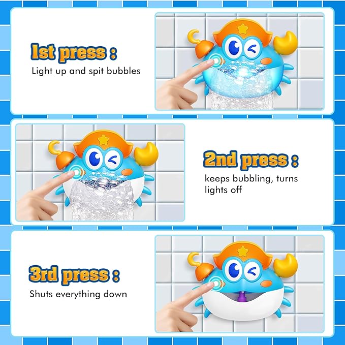• EYE-CATCHING LED LIGHTS: Turn on the crab bubble machine and enjoy a dazzling light show as vibrant bubbles quickly fill the bathtub. You can also turn off the lights (bubble-only mode) when desired. (The built-in LED lights are safe for children’s eyes.)