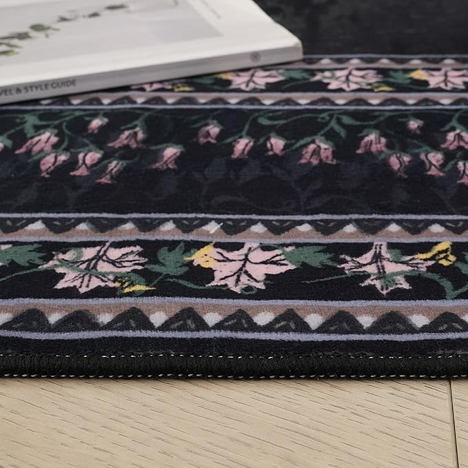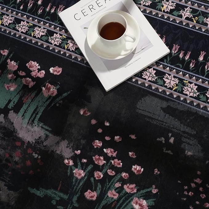 Area Rugs 8x10 Clearance Impressionist-Style Vintage Washable Area Rug Non Slip Low Pile Large Rug for Bedroom Farmhouse Dining Room Kids Playroom, Black