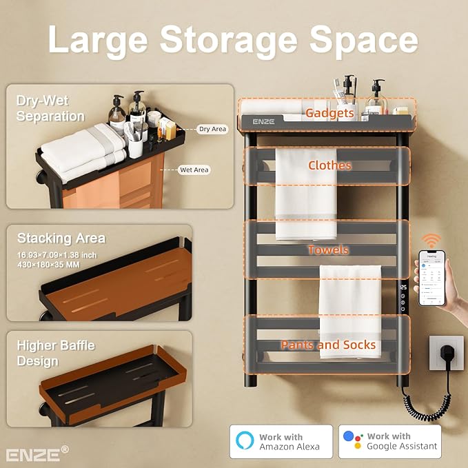 ENZE Heated Towel Rack with Shelf and Wi-Fi App Control, 8 Bars Electric Wall Mounted Towel Warmer with Timer & Adjustable Temperature, Low Carbon Steel, Plug-in/Hardwired, Matte Black