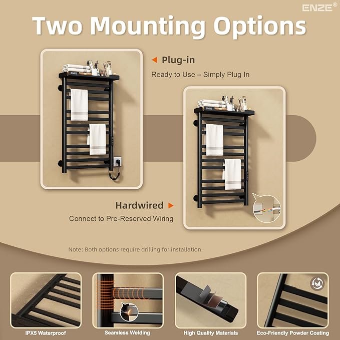 • 【Flexible Installation: Plug-in/Hardwired】 Whether you're retrofitting or renovating, this unit supports both plug-in towel warmer bars and hardwired towel warmer installations. Made of eco-coated low carbon steel, it’s a durable heated towel rack for bathroom, ideal as a wall-mounted heated towel rack or towel bar warmer for bathroom.
