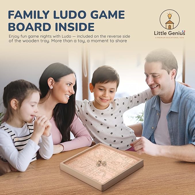 • 2-in-1 Wooden Tray with Board Game – Flip the sliding lid to reveal a classic Ludo board; build first, then enjoy family game time.