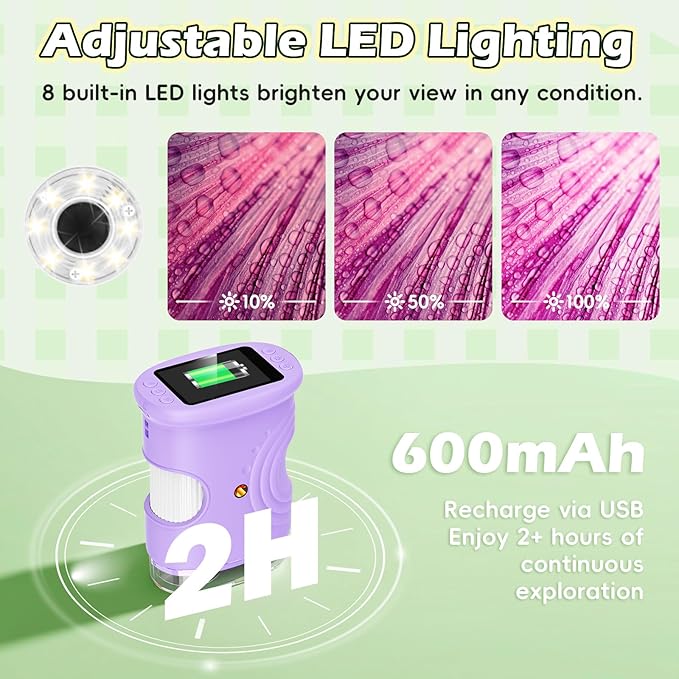 • Portable Pocket Size for On-the-Go Science: Weighing only 136g (0.3 lbs) and measuring about 4” x 3.15” (10cm x 8cm ), this mini microscope for kids fits perfectly in toddlers' small hands and pockets. It comes with a convenient neck strap, a compact and lightweight design makes it ideal for both indoor fun and outdoor adventures, encouraging discovery anytime, anywhere
