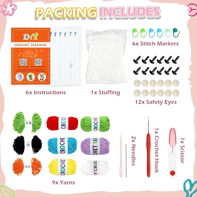 • ALL IN ONE CROCHET KIT】: Along with Easy Yarn and easy-to-follow video tutorials, you'll receive every other tool you'd need to begin crocheting with our kits. The beginner crochet kit also includes a scissors, a crochet hook, 2 needles, eyes, 6 marker buckles, cotton stuffing, 6 written crochet patten instructions and video tutorials.
