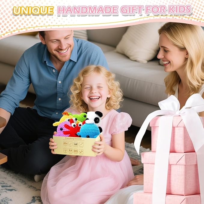 • 【CROCHET KIT FOR COMPLETE BEGINNERS】: Our 6 PCS Crochet Kids Kit is perfect for complete beginners; Our step-by-step video tutorial accompanies DIY starter kit and its easy to follow; A pre-started crochet piece comes included along with other beginner-friendly supplies. Looking for cute crochet animals kit, This makes the perfect knitting toy.
