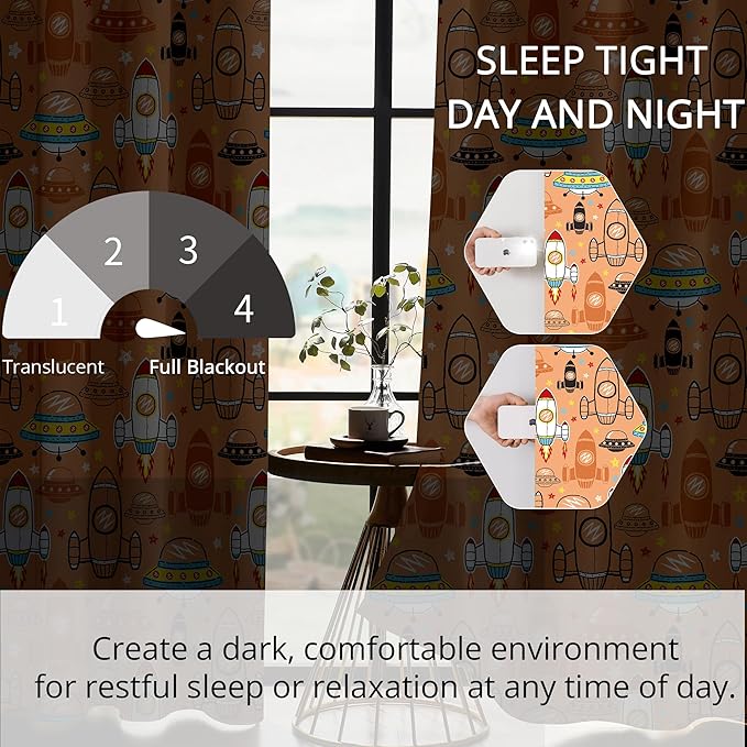 Kids Space UFO Rocket Blackout Curtains - 100% Blackout, Thermal Insulated, Noise Reducing, Perfect for Kids Room and Nursery, 2 Panels (Sunny Space Parade, W52×L63)
