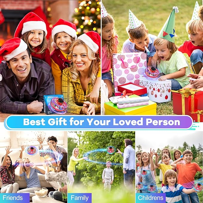 • 😊【FUN and SIMPLE UFO DRONE FLYING TOY】Turn on the power button of flying toys,hold down the center axis to rotate the wheel to start,then throw it away and fly.Different throwing speeds and angles allow different flight paths,tricks,and high-speed maneuvers.Stop the flying by grabbing the mini drone with your hand.You can have fun with friends, family,colleagues indoors,outdoors,at school and in the office.Hover toy is a popular social game at birthday parties,family gatherings.