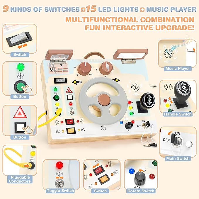 • 【Car-Themed Interactive Fun & Creativity Stimulation】This busy board is themed around car driving, combining 9 switches, 15 LED lights, a music player, and simulated driving functions. The montessori busy board features a rotating steering wheel that makes sounds and an operable gearshift lever. The busy boards can develops children's imagination, sensory perception, and hand-eye coordination, allowing them to explore the world of transportation through fun and interactive play. Requires 3*AA batteries (not included).