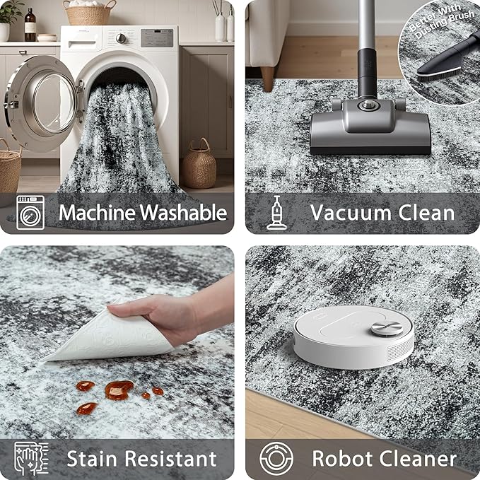 Area Rug 9x12 Washable Rugs: Abstract Large Living Room Rugs with Non-Slip Backing, Stain Resistant Indoor Floor Carpet for Bedroom Dining Room Table Nursery Hallway Home Office Dark Black/Gray
