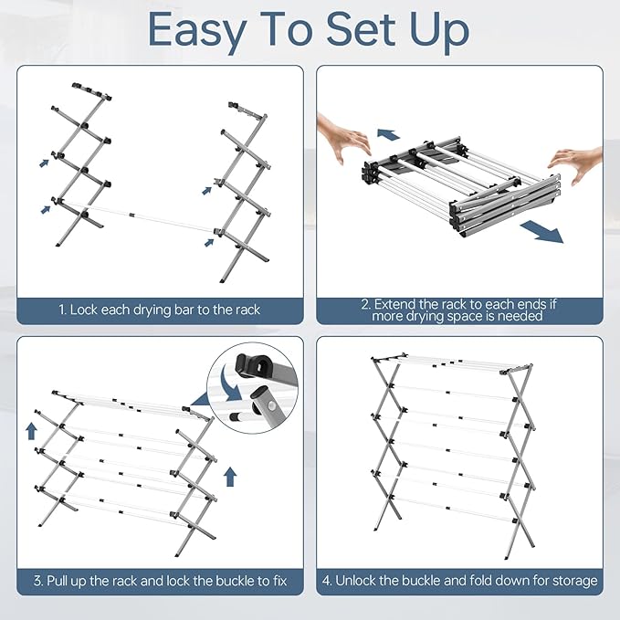 • Easy Assembly - The small laundry drying rack is super easy to put together. Just snap each bar into place and snap the end piece in on top tier for locking