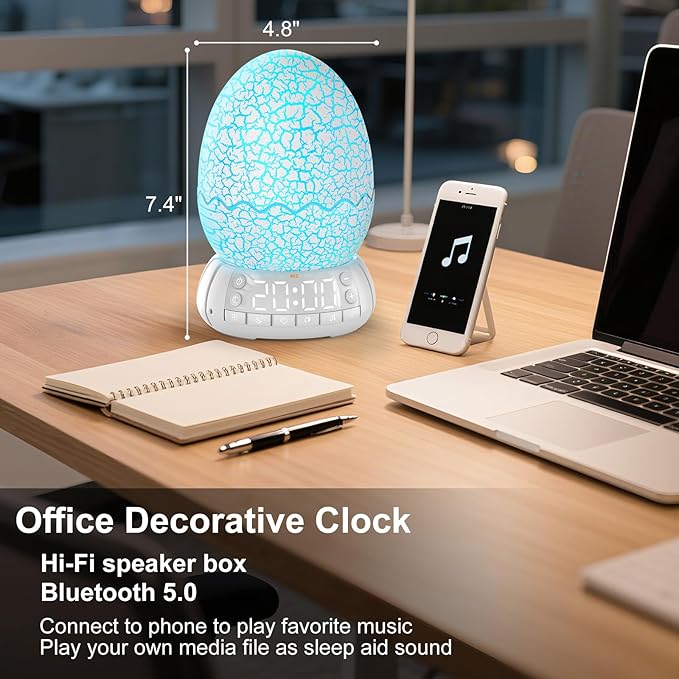 • 【Multi-Function and Usage】It can be used as a digital clock on desk, dinosaur egg night light for bedroom, mini bluetooth speaker, sleep trainer for kids and adult. It's great gift for birthday, anniversaries, Valentine's Day, Easter, Thanksgiving, Halloween, Christmas, etc.
