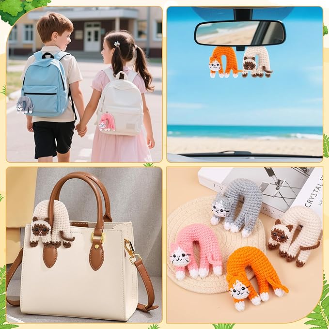 • Create 4 Arched Back Cats: Make your own set of handmade crochet cats with four different cat color patterns, including an orange tabby, a siamese, a classic grey, and a playful pink kitten. The funny finished cats are perfect as home decorations, desk buddies, adorable children's toys, car pendants, bedroom ornaments, bag charms, or key chain.Perfect for cat lovers and crochet enthusiasts.