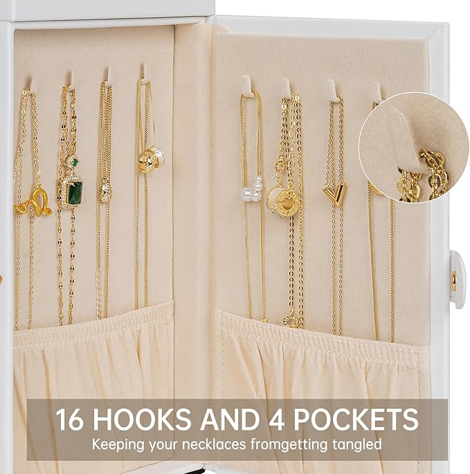 • 6 LAYERS with 5 Versatile Pull Out Drawers 2 Hidden Side Cabinets, The two deeper bottoms of the 5 removable drawers has only one compartment; Drawer 1 has 16 equal size slots; Drawer 2 has 9 equal size slots; Drawer 3 has 3 equal size slots. The 2 Swing out Cabinets including 8 hooks and 2 pockets, help to keep your necklaces from getting tangled