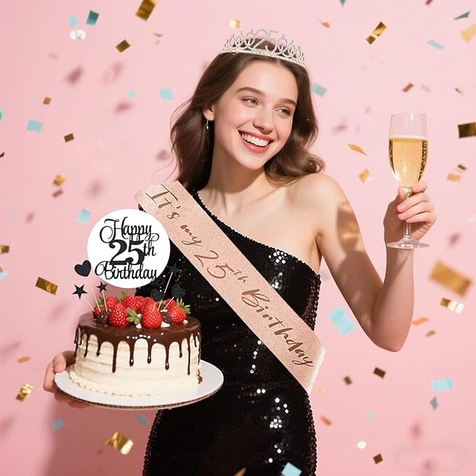 • 25th Rhinestone Crown & Sparkly Sash: The birthday sash, made of soft fabric via hot-press stamping glitter technique, features superior quality with non-shedding glitter and rose gold it's my 25 birthday letters. The crown, crafted from sturdy hard alloy with dazzling rhinestones, is meticulously designed for 25th birthday parties.