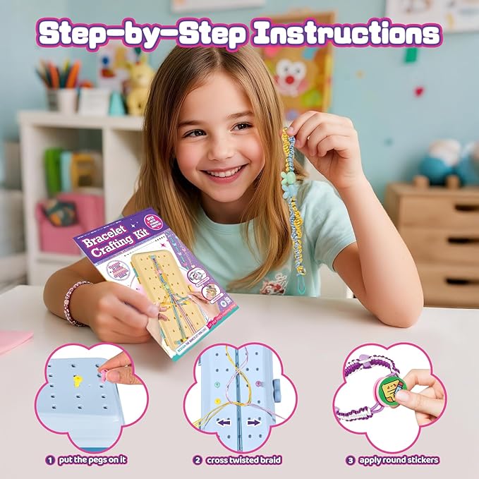 • Friendship Bracelet Making Kit:Our friendship bracelet kit includes 26 bundles of bracelet string,25 buttons, 25 elastic strings, 30 pins, 32 colorful beads, stickers, and non-slip pads for easy crafting. With the step-by-step illustrated guide, using the friendship bracelet maker, kids ages 6 and up can effortlessly craft their own unique friendship bracelets and enjoy endless creative fun