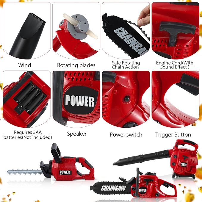 • Complete Play Tool Set for Kids: our kids lawn equipment toys set is a nice bundle to keep your child entertained and engaged; The set includes a fake leaf blower, a fake hedge trimmer, and a fake chainsaw, all designed to match real world models; In bold red and black colors