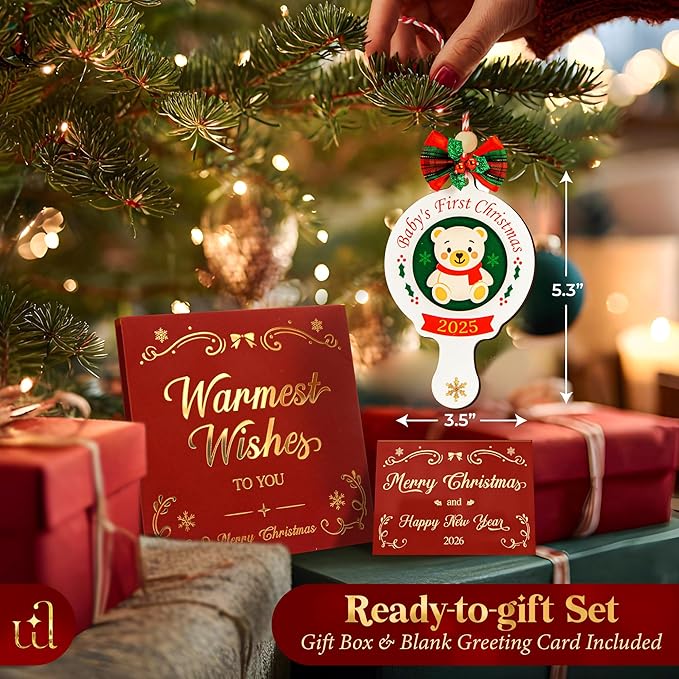 • Set Include: Each set comes with one ornament baby first christmas and a blank card for your own message. Perfect as a baby girl first ornament, babys 1st christmas ornament 2025, or new baby ornament 2025 to hang on your baby first christmas tree.