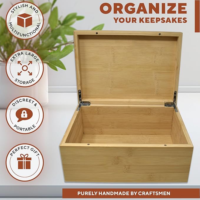 • Material: Large Christmas boxes decorative made of high-quality bamboo wood with smooth varnished surface, 100 degree durable & reliable metal hinges lock the lid in an upright position for more convenience