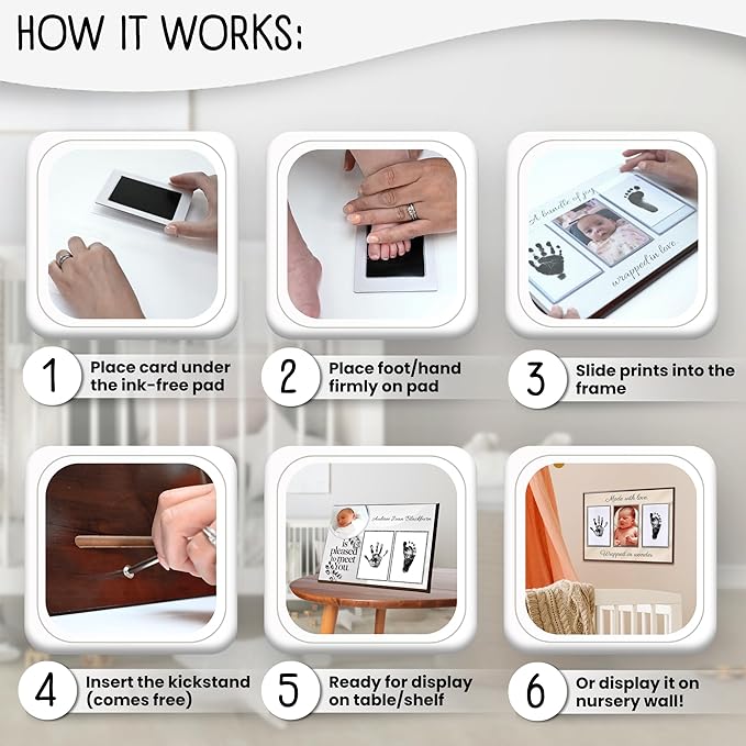 • NO HASSLE, NO MESS BABY KEEPSAKE - With lovely designs you can choose from, built-in acrylic cards to insert the prints to, a printed photo of your baby, no-mess inkpads for baby hand and footprints, this is the easiest way to capture your baby’s adorable prints forever. It comes with 4 print cards and 4 safe, no-mess ink pads, so you can try to get the perfect print more than once!