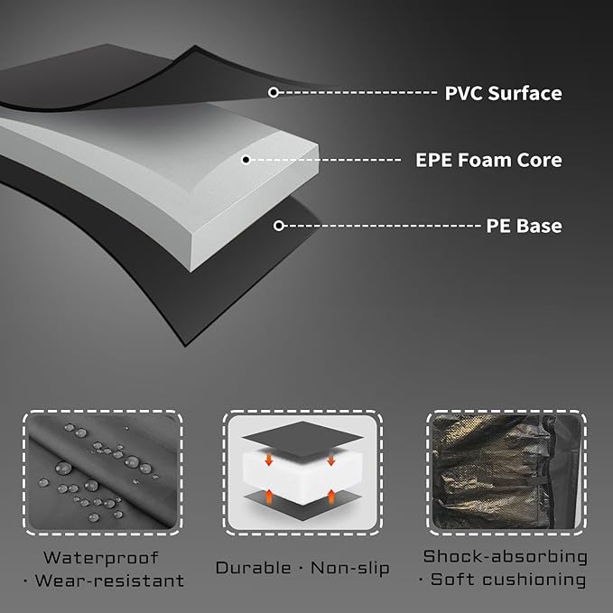 • 【PREMIUM MATERIAL】The outer layer shell is manufactured with high density PVC on top and heavy-duty PE on the bottom, 0.6 inch high-density EPE foam inside