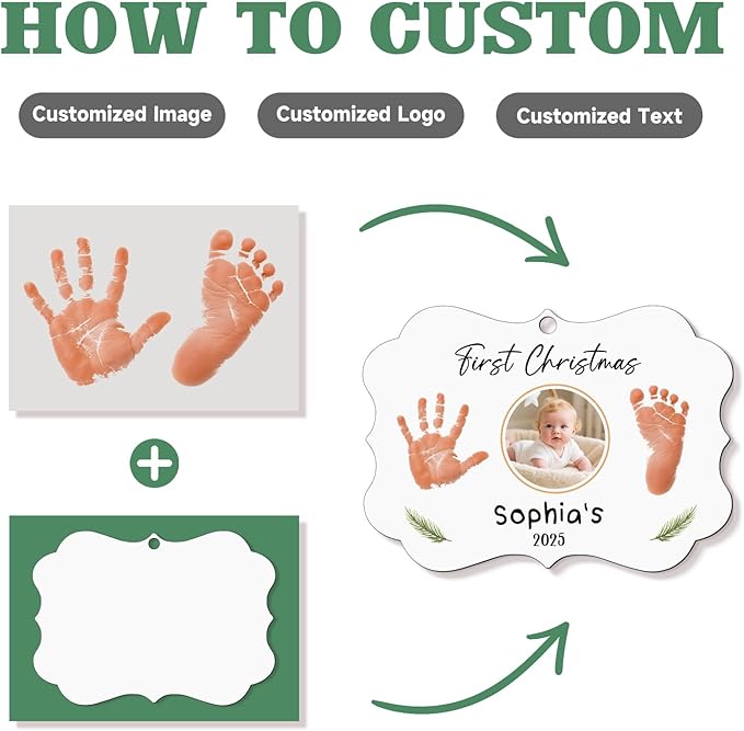 • FIRST CHRISTMAS ORNAMENT: Click "Customize Now" to upload a photo of your baby's handprint/footprint, add name and date. This personalized ornament is perfect for commemorating your baby’s first Christmas. It is suitable for both boys and girls. Personalizing your own ornament and celebrating baby's first Christmas with this cherished baby's first Christmas ornament 2025.